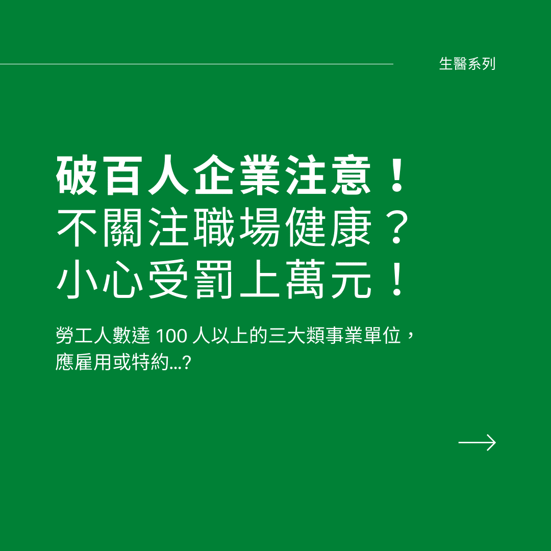 勞動部《勞工健康保護規則》第 4 條 規定, 2020 年 1 月 1 日 起 , 勞工人數達 100 人以上的三大類事業單位,應雇用或特約職業醫學科專科醫師及特約護理人員。